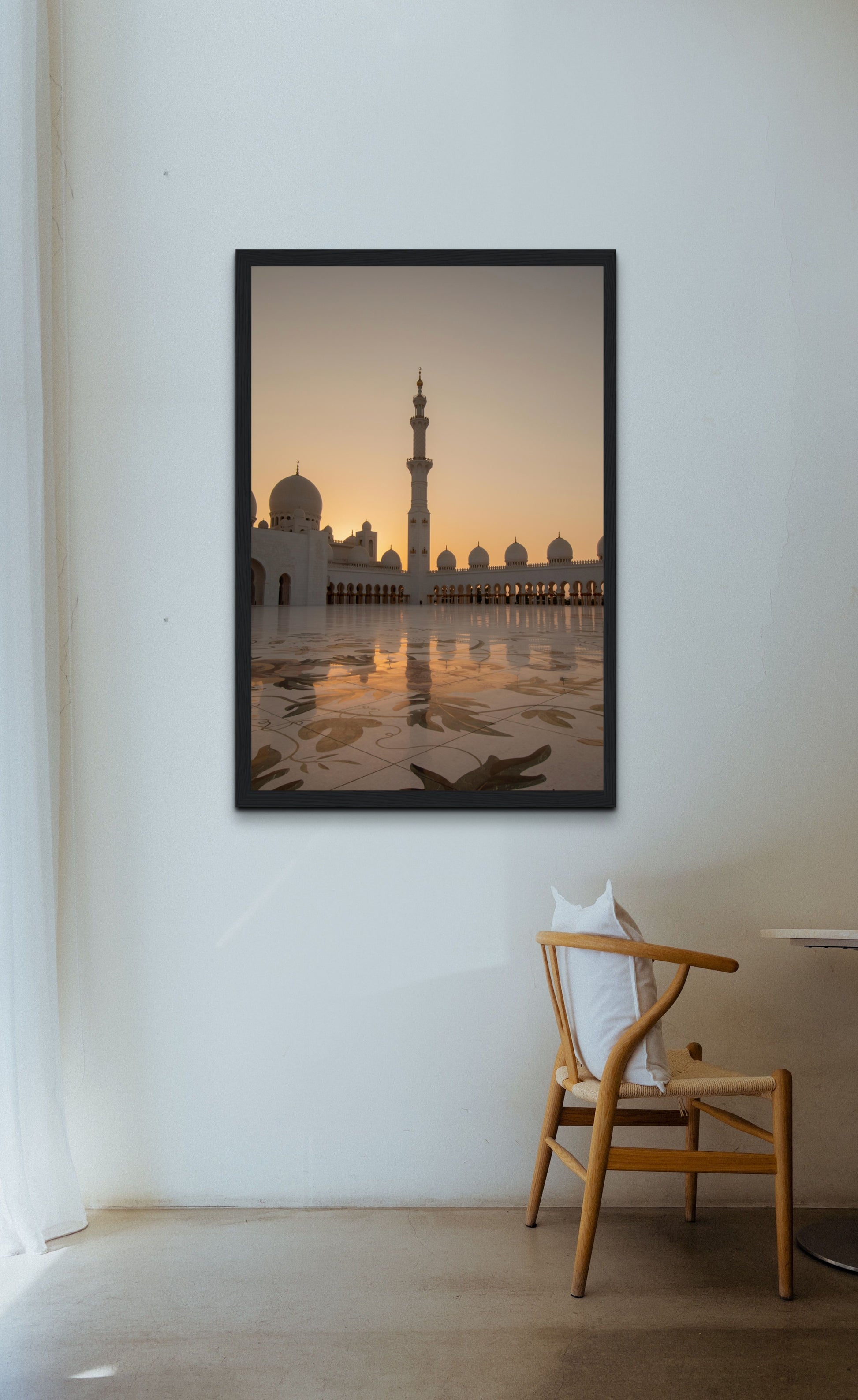 Impresionante vista de la Gran Mezquita Sheikh Zayed al atardecer, con sus majestuosas cúpulas y minaretes bañados por una suave luz dorada. Esta imagen captura la elegancia y la serenidad de la arquitectura islámica, perfecta para aportar una sensación de paz y belleza a cualquier espacio.