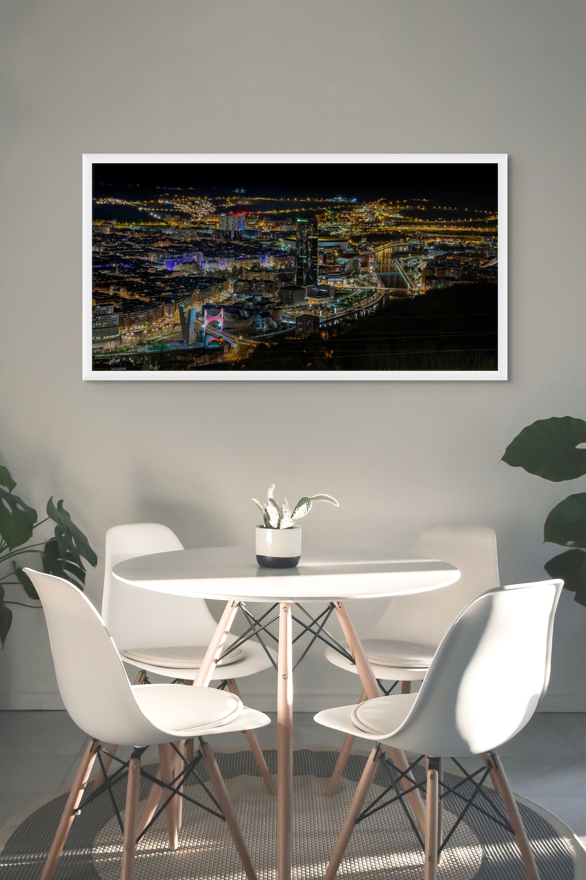 Vista panorámica de Bilbao iluminada por la noche , con los emblemáticos puentes y edificios iluminados, incluido el Museo Guggenheim. Esta vibrante imagen captura la esencia de las maravillas culturales y arquitectónicas de España, perfecta para los amantes de la exploración urbana y el diseño moderno.