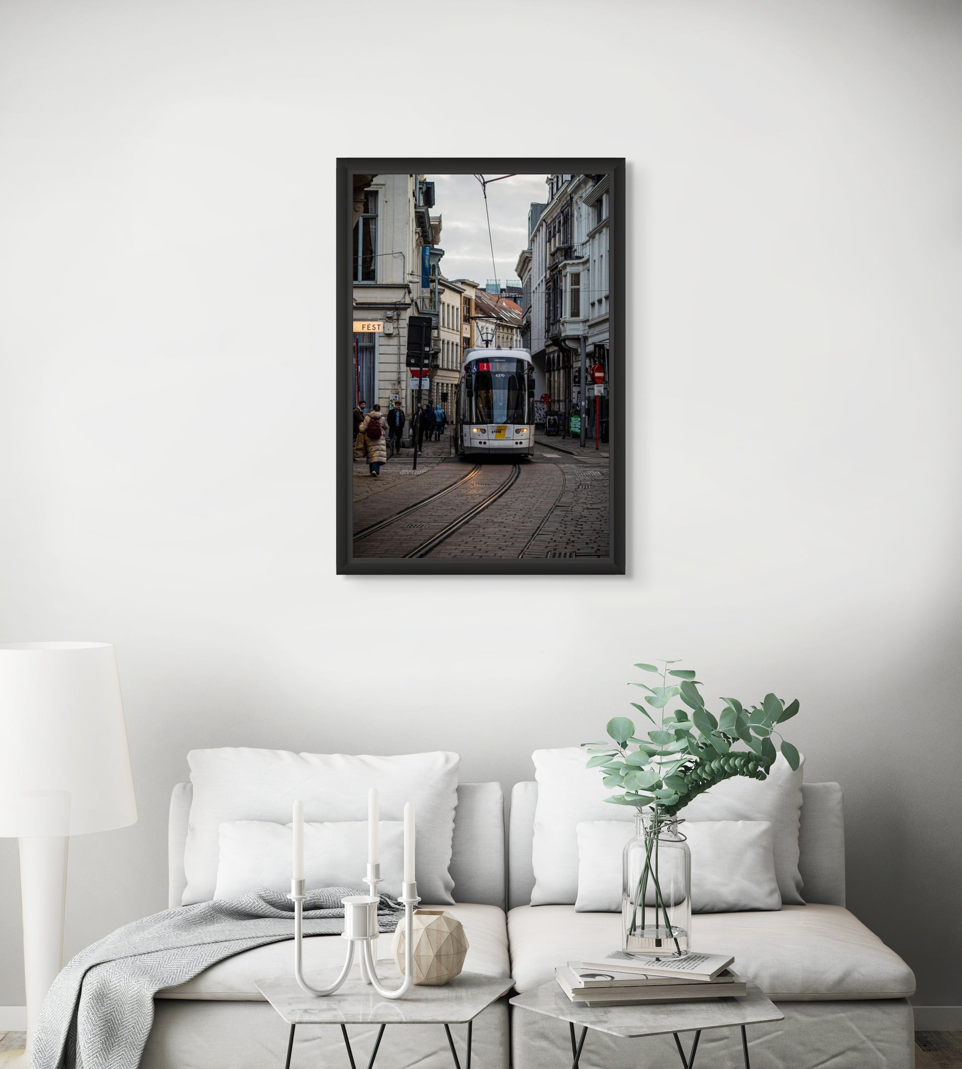 Una vista encantadora de un tranvía que recorre una estrecha calle europea, flanqueada por edificios históricos y peatones bulliciosos. La escena urbana captura la energía de la vida de la ciudad, perfecta para quienes aprecian el transporte público y la atmósfera vibrante de las ciudades europeas.