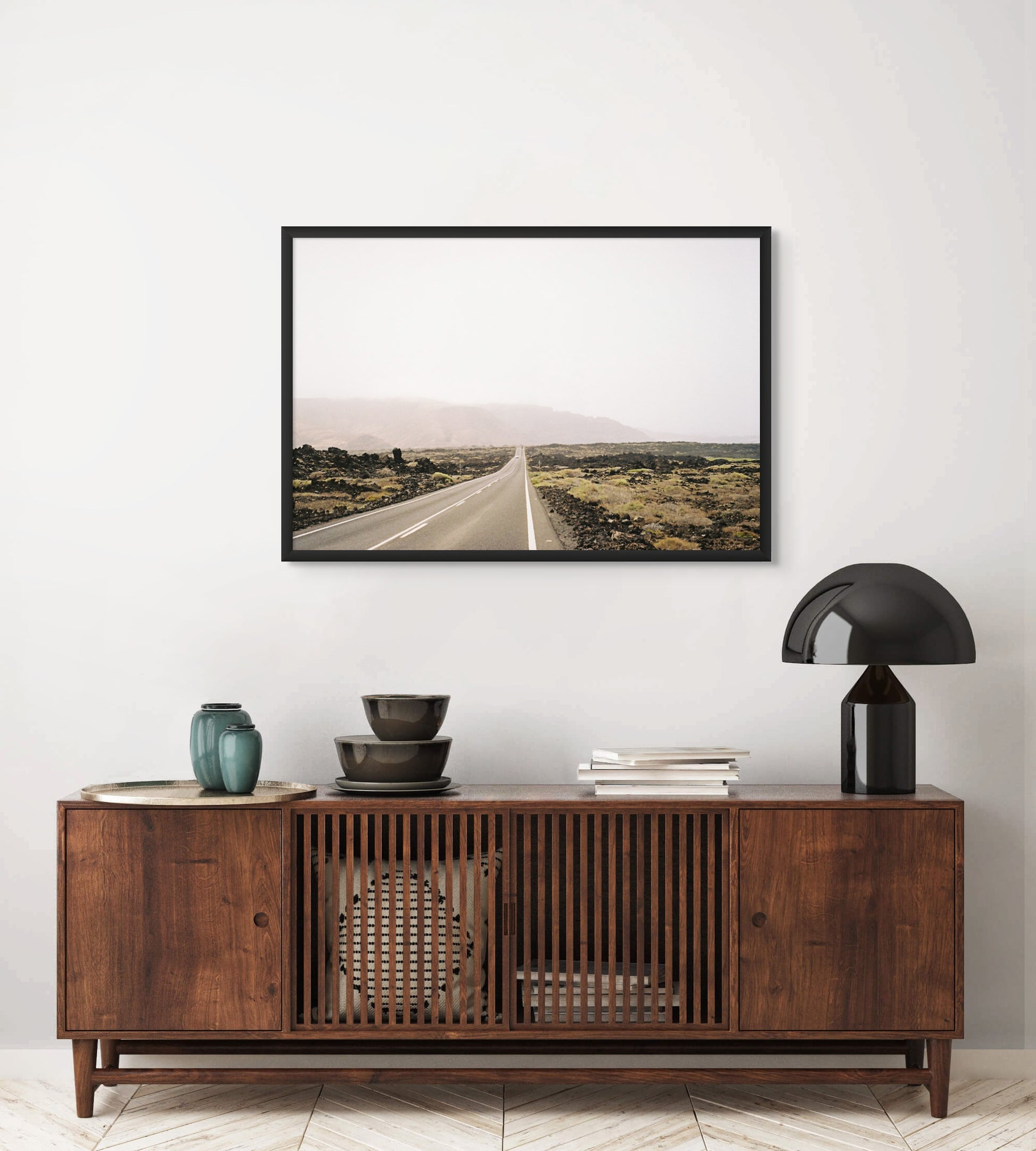 Una imagen tranquila y amplia de una carretera infinita que se extiende a través de un paisaje rocoso, con niebla que se desliza sobre las colinas distantes. La simplicidad y la inmensidad de esta escena evocan una sensación de soledad y libertad, lo que la convierte en una adición perfecta para quienes aprecian los paisajes minimalistas y las aventuras en carreteras abiertas.