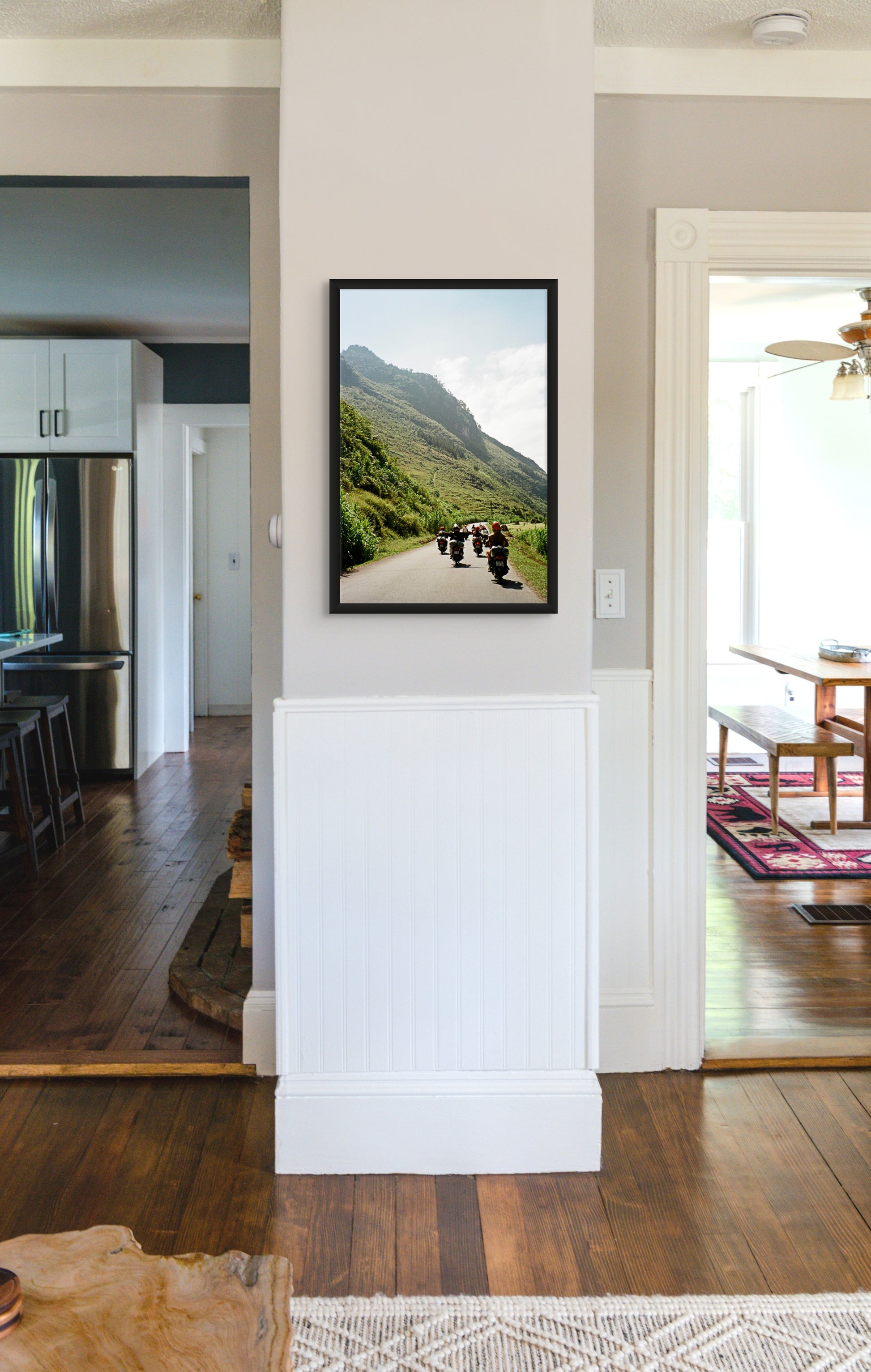 Una imagen panorámica de un grupo de motos que recorren una carretera sinuosa entre una vegetación exuberante, con imponentes montañas de fondo. La aventura y la libertad capturadas en esta fotografía la convierten en una pieza ideal para quienes aman los viajes por carretera y la belleza de la naturaleza.