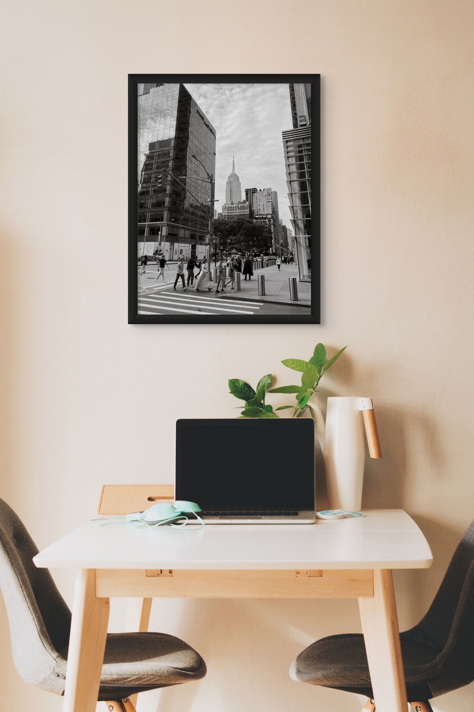 Captura la vibrante energía del centro de la ciudad de Nueva York con esta impresionante impresión artística en blanco y negro. Con rascacielos icónicos y calles bulliciosas, es perfecta para interiores modernos, oficinas y decoración de temática urbana. Una pieza atemporal para los amantes de la arquitectura y la vida urbana.