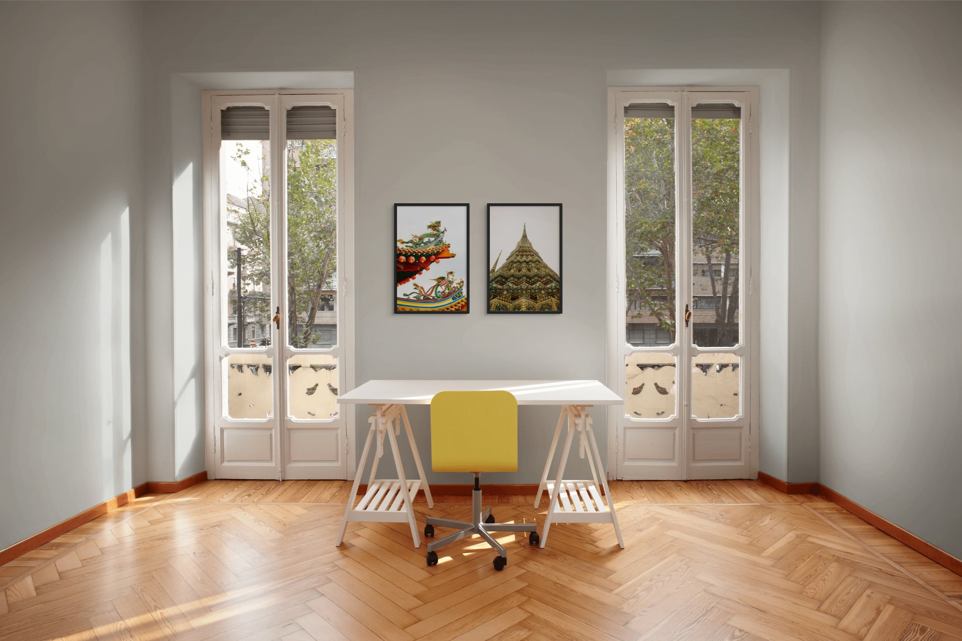 Primer plano vibrante del techo de un templo asiático tradicional adornado con intrincadas esculturas de dragones y fénix, rodeado de faroles rojos brillantes. El diseño colorido y detallado captura la esencia del patrimonio cultural y la espiritualidad, ideal para agregar un toque de elegancia oriental a cualquier habitación.