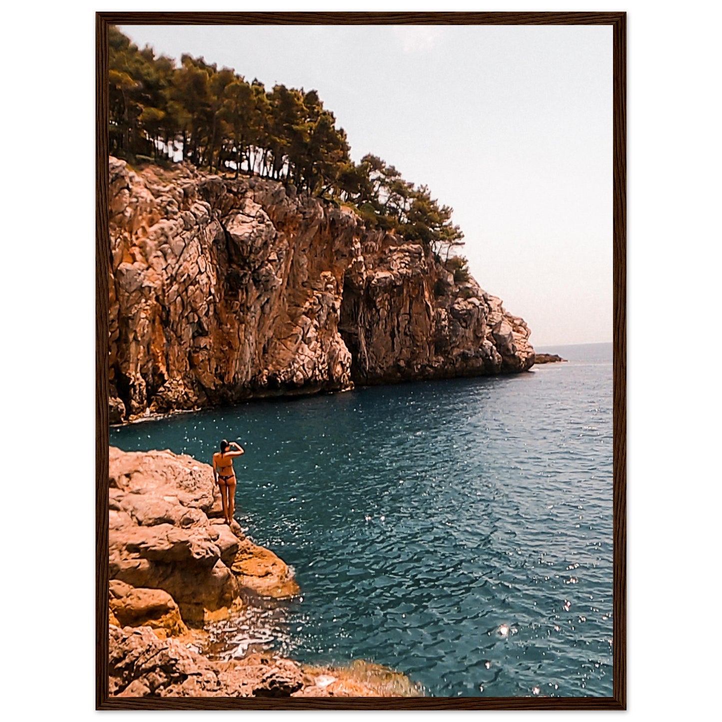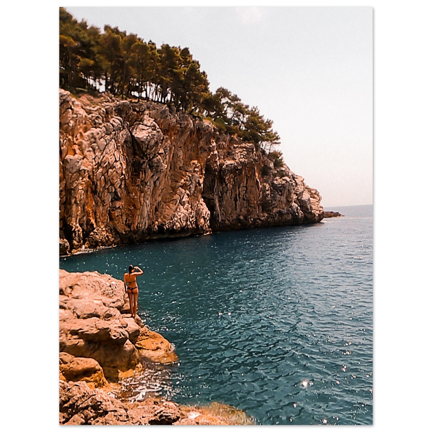 A captivating scene of a girl standing on rocky terrain by the edge of crystal-clear blue water, with towering cliffs and trees in the background. The serene beauty of the coastline evokes a sense of adventure and tranquility, making it an ideal piece for those who appreciate nature and exploration.