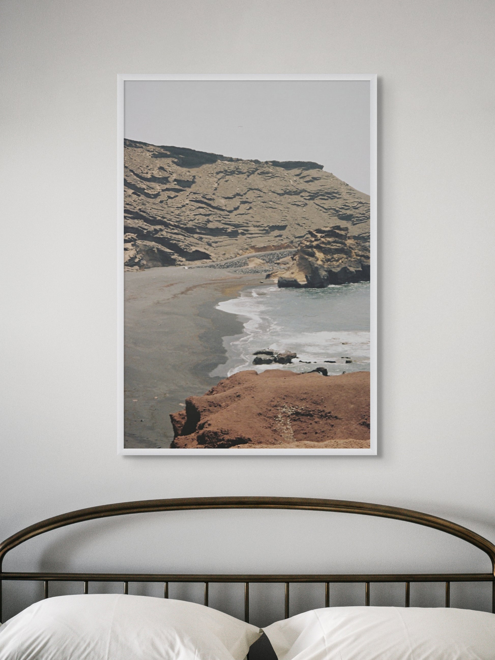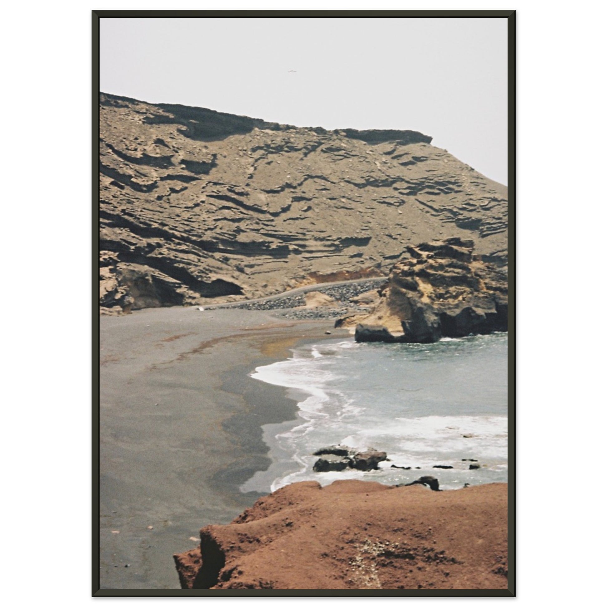 A dramatic scene of a rocky Empty Beach with dark volcanic cliffs and waves gently lapping at the shore. The earthy tones of the landscape and the soft contrast of the water create a serene yet powerful atmosphere, making it perfect for bringing a rugged natural beauty into any space.