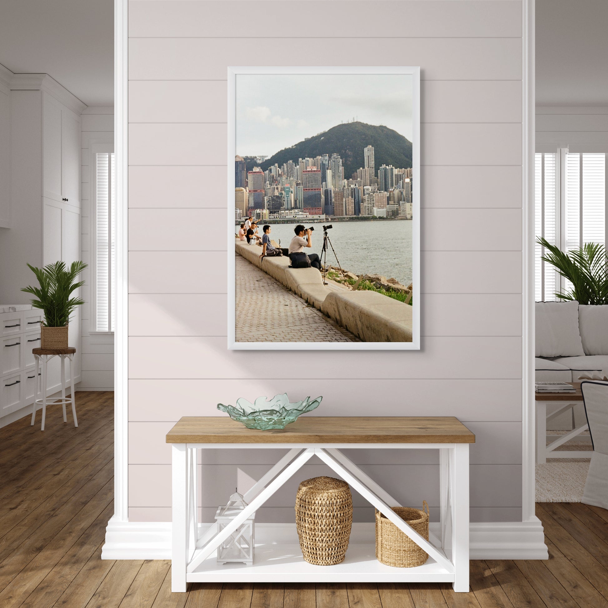 A scenic shot of photographers capturing the stunning Hong Kong skyline along the waterfront, with a backdrop of towering skyscrapers and lush hills. The image evokes a sense of creativity and urban exploration, perfect for anyone who appreciates photography, travel, and vibrant cityscapes.