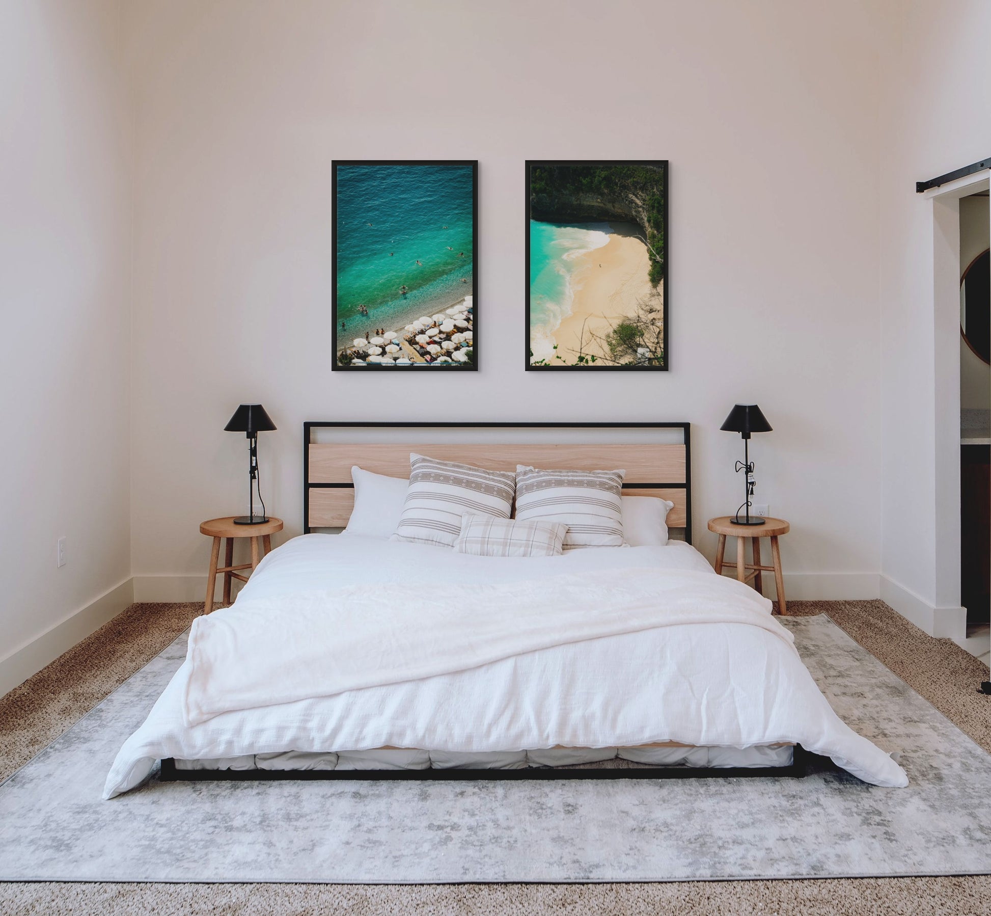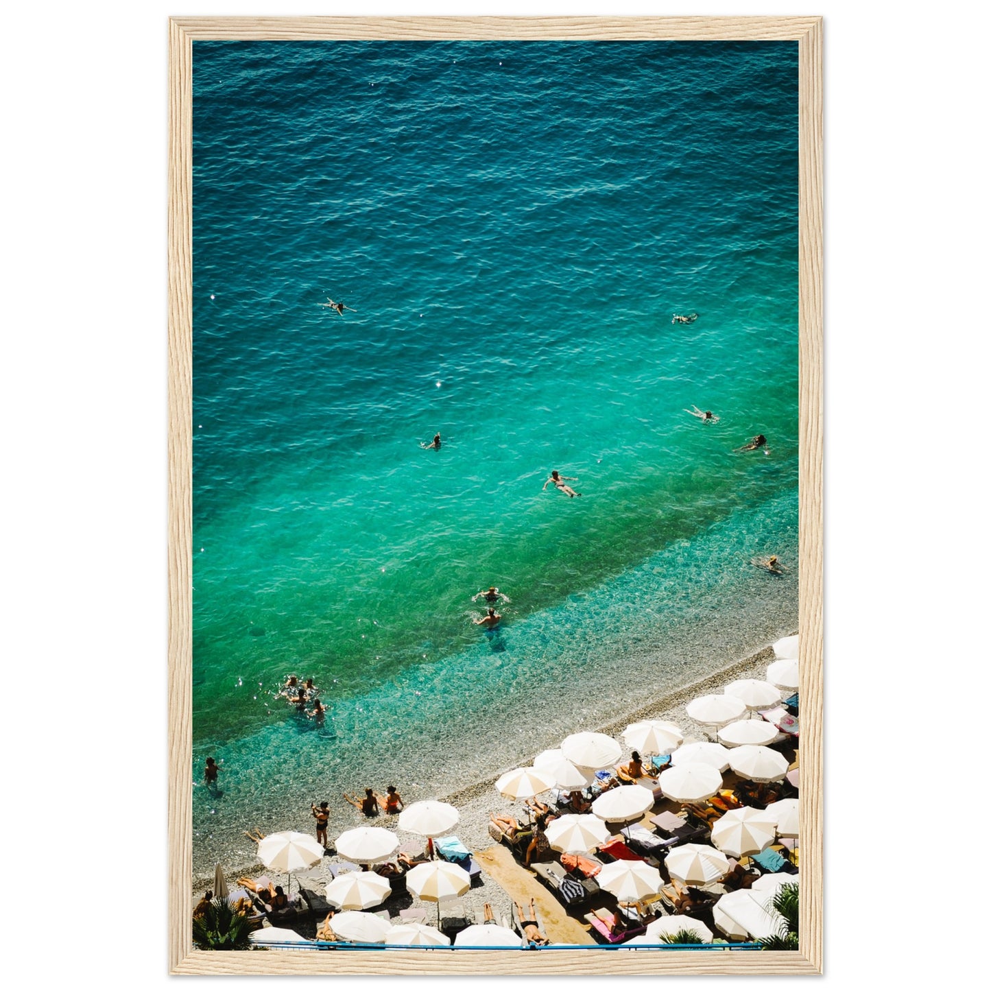 A stunning aerial capture of a sun-drenched beach, where crystal-clear turquoise waters meet golden sands lined with elegant umbrellas. A perfect blend of relaxation and coastal charm.