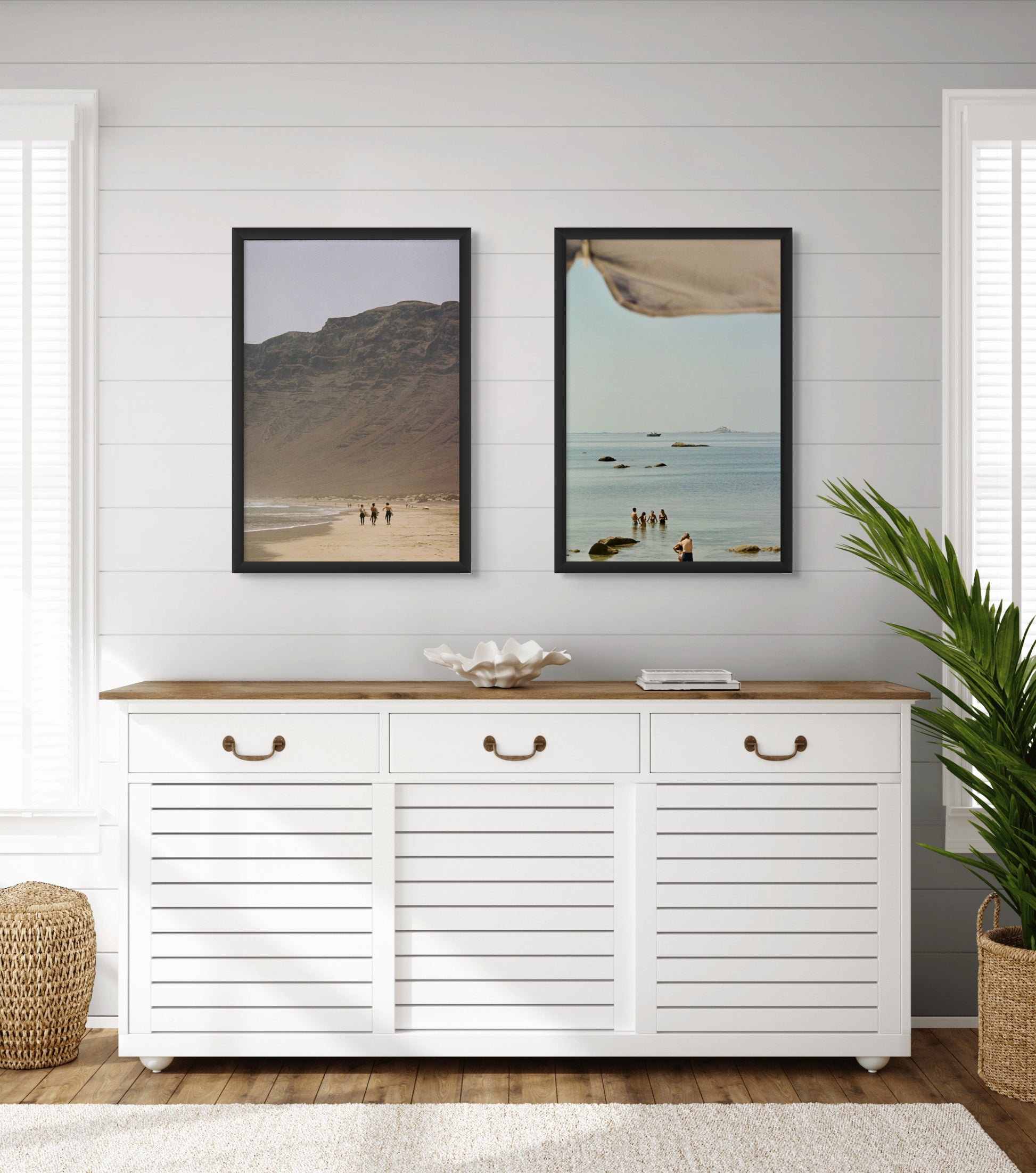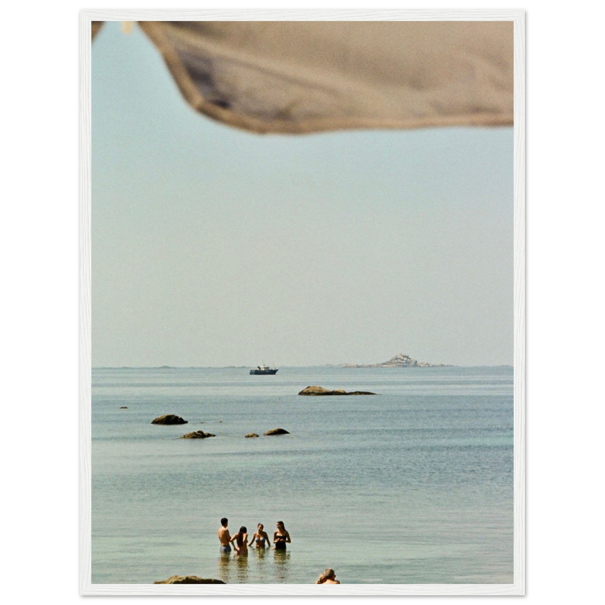 A peaceful Sunny Beach Day scene with a group of people standing in shallow water, surrounded by smooth rocks and calm sea. The soft colors and relaxed atmosphere of the image capture the essence of a quiet summer day by the water, perfect for creating a serene, beachy vibe in any space