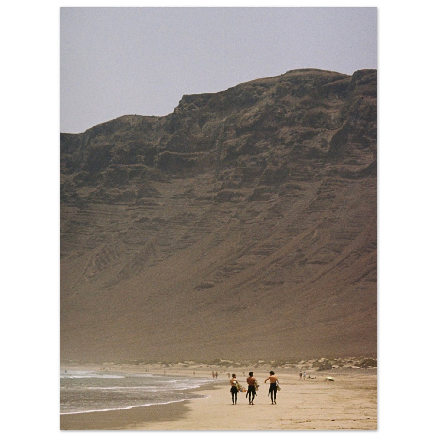 A serene image of three people walking along a quiet beach, with towering mountains rising in the background. The contrast of the rugged landscape and the peaceful beach creates a perfect balance of natural beauty and calm, ideal for those who appreciate both adventure and tranquility.