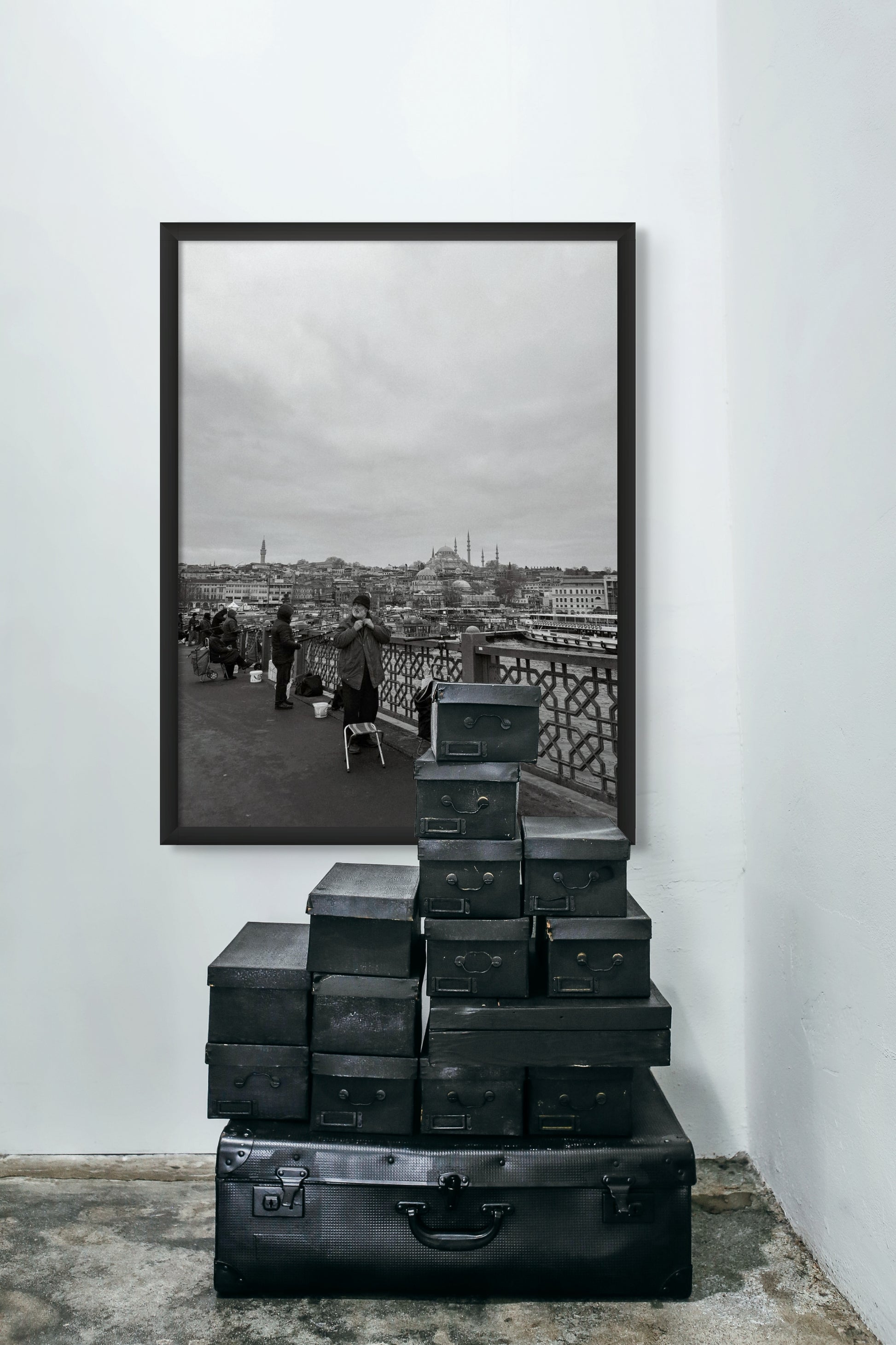 A striking black-and-white photograph capturing a Turkish Fisherman in Istanbul showing he vibrant daily life on a bridge, with a backdrop of historic domes and minarets. This image combines urban charm with cultural authenticity, ideal for those inspired by cityscapes and human stories.